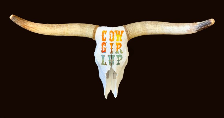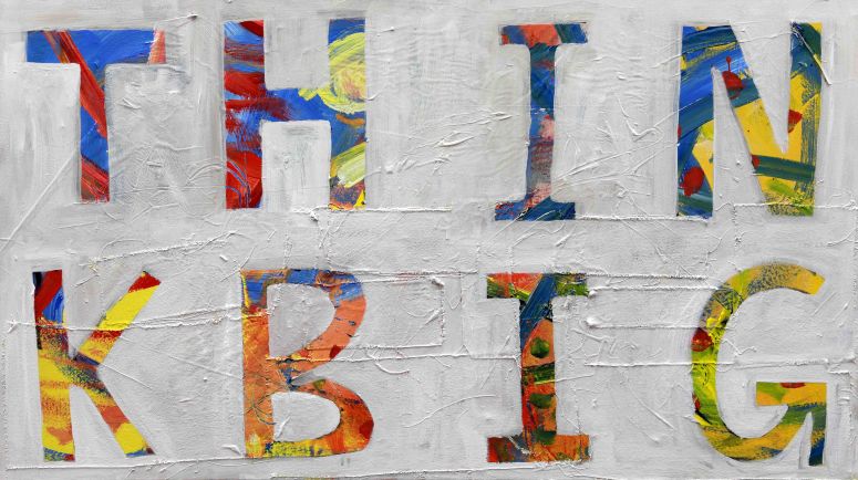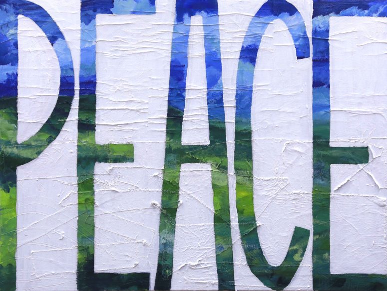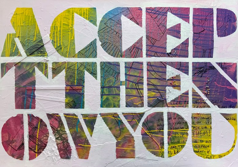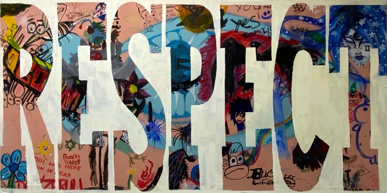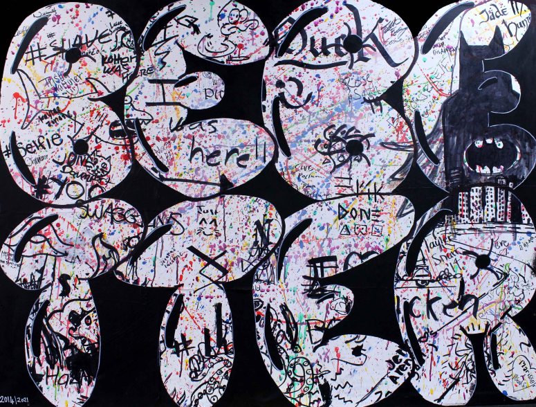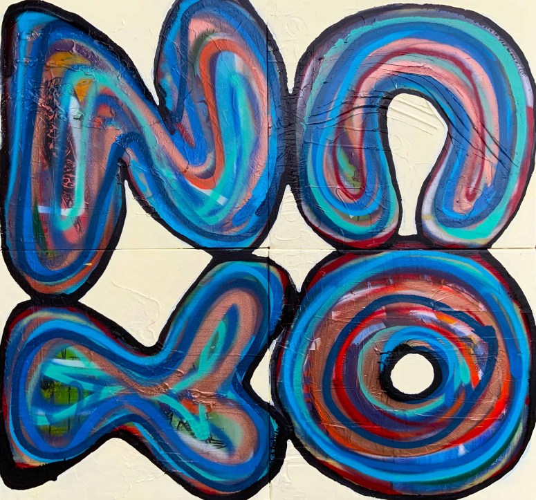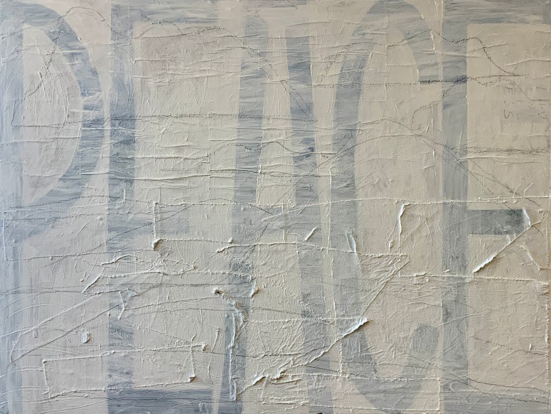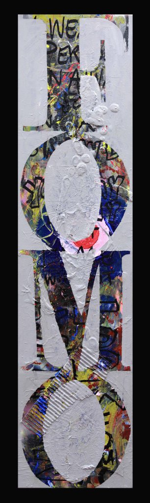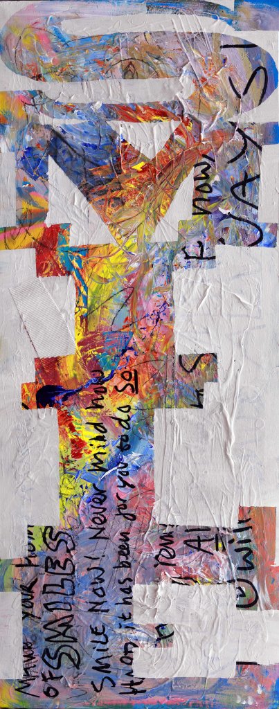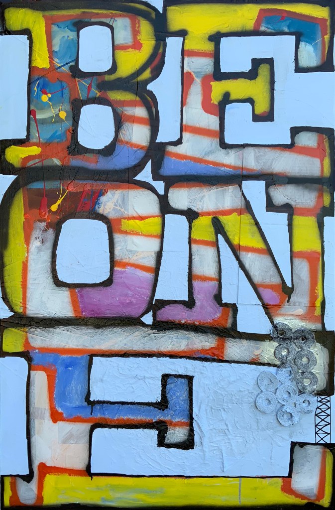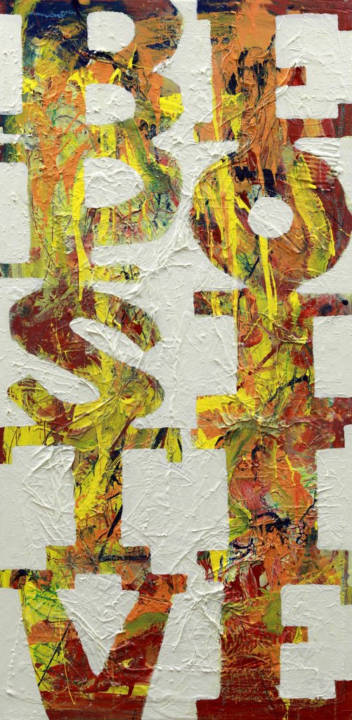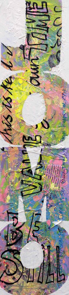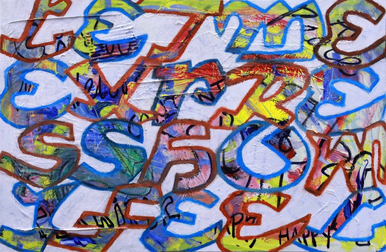 These paintings are word based. They look at language construct and word meanings. They are also ‘action’ paintings – requiring large body movements and intense energy to create. The paintings contain the evidence of flinging and spraying paint, as well as gluing found objects, trash and recyclables. This creates a complexity of surface, which is then masked with letters and painted over to separate the background from the letterforms. Edge work is then carried out to complete the letters.