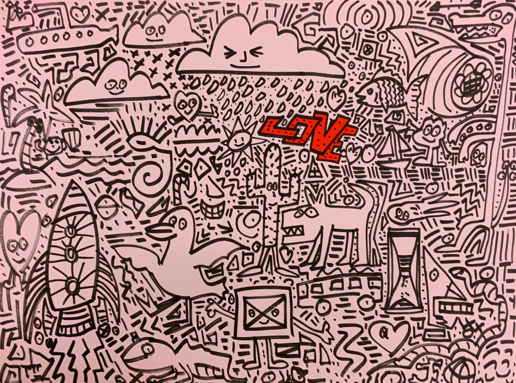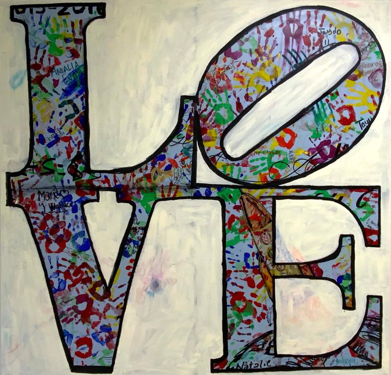 These paintings express the joy of physical motion, color and texture. They explore the genre of Action Painting, Splatter and Drip Art, Typography and Stenciling.