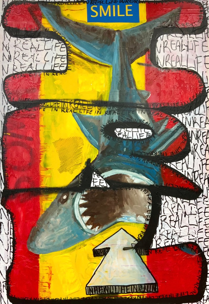 A second concept I work with is more about social construct. I have noticed how interactions between people are also not the same for everyone. Interactions that happen in real life and interactions that happen digitally can create joy and also anxiety. Both these interactions have elements of masking the truth, or to relate to my paintings, masking our surface; In effect, hiding and revealing our very natures to and from each other.